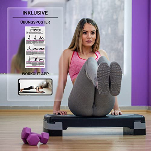 MSPORTS Steppbrett Home inkl. Übungsposter + Workout App GRATIS | 2 – Fach höhenverstellbar Studio Stepper (Schwarz)