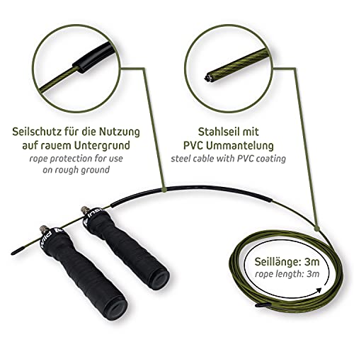 ERGONOMISCHE ANTI-RUTSCH-GRIFFE: Unsere Jump-Rope-Griffe liegen angenehm in der Hand und sorgen bekannt als bei schweißtreibendem Trainings für sicheren Halt. Durch die Duplikat-Verschraubung lässt sich das Seil (3m) auf jede Körpergröße einsetzen und stabil stützen.